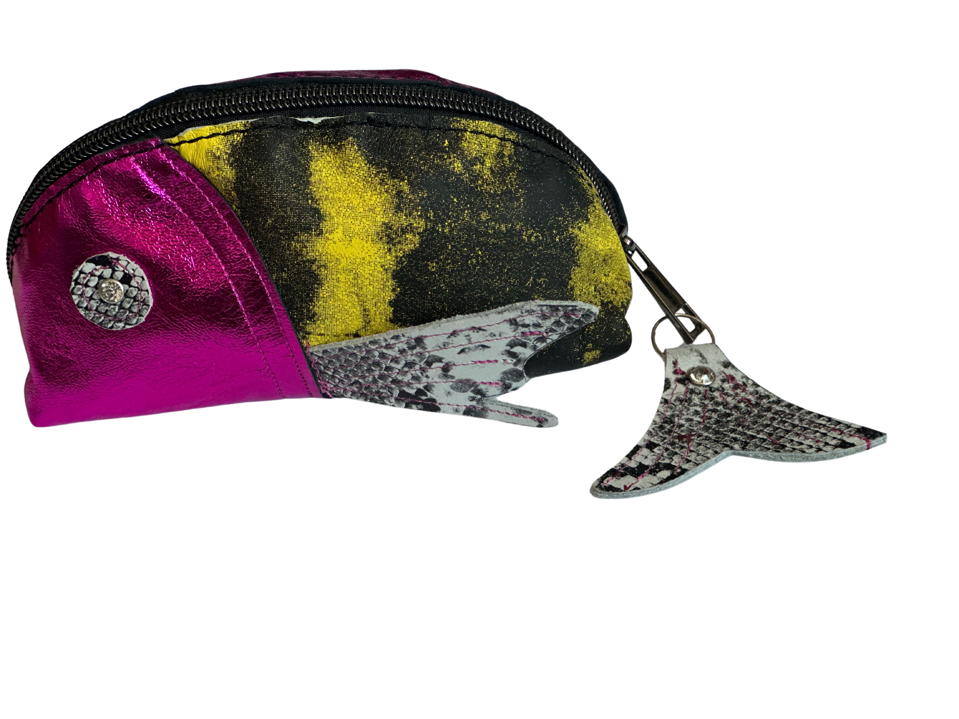 Make a splash with the Whimsical Mermaid Leather Cosmetic Bag, a playful yet edgy accessory designed to stand out. Inspired by the beauty of the sea, this handcrafted bag features a unique fish-inspired shape, complete with a shimmering metallic pink leather head, a black and yellow distressed leather body, and an intricately textured silver fish tail.